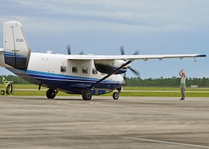 Airman Tayler Gottschalk, a 919th Special Operations Medical Squadron reservist, affixes a container to a trap near Post’l Point July 20 at Eglin Air Force Base, Fla. This permanently mounted trap is used to catch the general mosquito population. It is powered by electricity and runs for days to