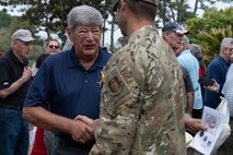 U.S. Air Force Lt. Col. Phillip Vaughn, Expeditionary Task Group commander (SOCSOUTH), meets Brig. Gen. Luis Fierro Urresta, commander of Air and Space Command (COAE), during the Air to Ground Integration opening ceremony in Guayaquil, Ecuador, for a Subject Matter Expert Exchange on August 25, 2025. Special Operations Command South (SOCSOUTH) conducts activities such as this exchange to strengthen relationships with partner nations and enhance their security capabilities. (U.S. Air Force photo by Master Sgt. Erica Campbell)
