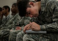 Noah Woods, ROTC student, signs the flight access roster during the ROTC Summer Leadership School July 7 at Duke Field, Fla. 50 cadets participated in the voluntary SLS program that teaches high school junior ROTC cadets, leadership, teamwork and self confidence in a highly structured and focused environment. (Air Force photo/Tech. Sgt. Jasmin Taylor)