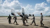 Maj. Dan Johnston, a 711th Special Operations Squadron pilot, briefs retired general officers on the squadron’s C-145A aircraft at Duke Field, Fla., July 7. The 919th Special Operations Wing invited the distinguished visitors, some that included former commanders of the wing, for a base tour and briefings that updated them on the Air Force Reserve unit’s evolving mission. (U.S. Air Force photo/Dan Neely)