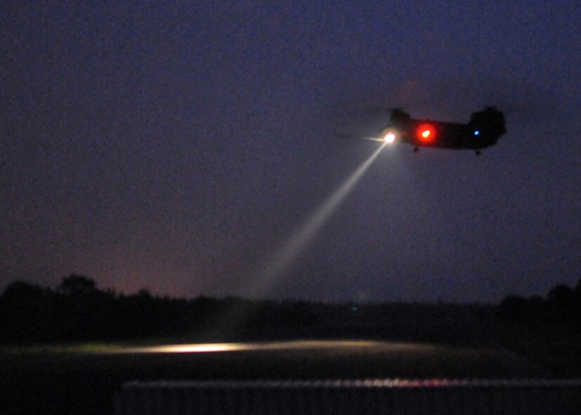 A CH-47 Chinook lifts off after dropping off Airmen during a recent two-day exercise at Duke Field Fla. Hurlburt Field Airmen were also dropped into the exercise location by a 919th Special Operations Wing MC-130E Combat Talon I to begin the exercise. The exercise provided counter-insurgency tactics, land navigation and mission planning to potential Air Force combat controllers. (U.S. Air Force photo/Tech. Sgt. Cheryl Foster)