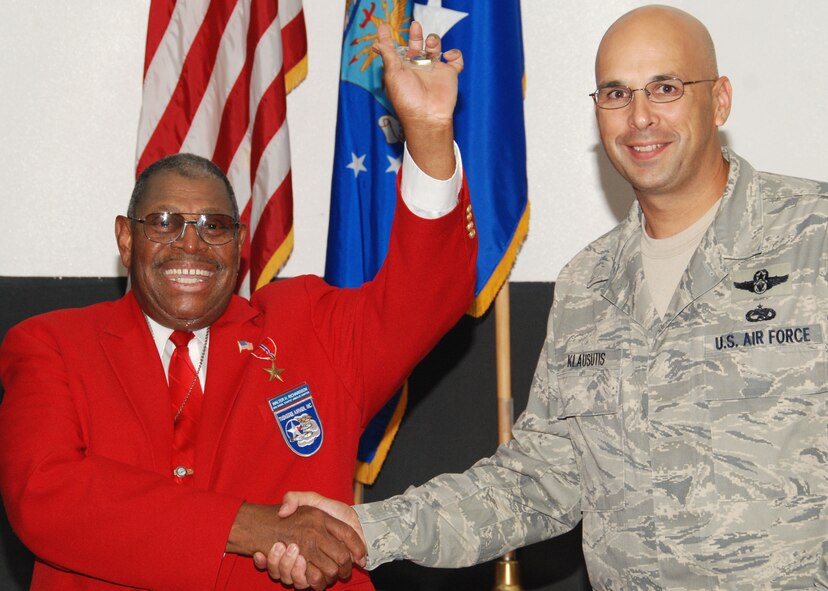 Retired Chief Master Sgt. Walter Richardson proudly displays the coin memento he received from CMSgt. Michael Klausutis, right, 919th Special Operations Wing command chief, inside the base theater July 10. An original member of the famed World War II-era Tuskegee Airmen, the 30-year veteran later spoke to a mass audience of 919th Special Operations Wing reservists about his role as one of the first African-American Airmen tasked to begin integrating the fledgling U.S. Air Force. (U.S. Air Force photo/Tech. Sgt. Cheryl Foster)