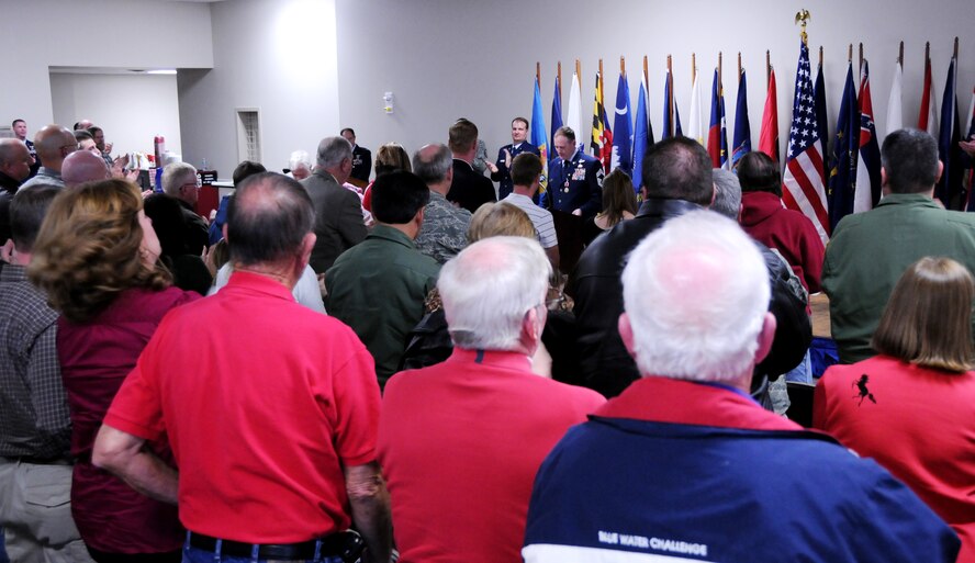 Chief Master Sgt. Lyle Spangler gets a standing ovation from the crowd during his retirement ceremony at Duke Field, Jan. 9. Chief Spangler began his 36-year career in 1974 and transitioned to the reserves in 1978. The chief completed his career as a member of the 711th Special Operations Squadron. U.S. Air Force photo by Tech. Sgt. Samuel King Jr.