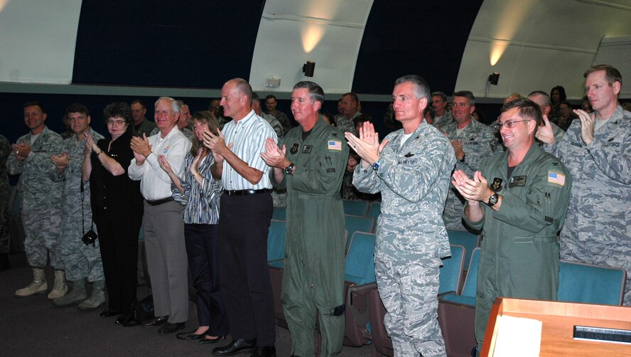 Chief Master Sergeant Rocky Hart, 919th Special Operations Wing command chief, receives a standing ovation from men and women of Duke Field at the base theater. Chief Hart was honored on his final duty day during the unit training assembly. The chief now moves on to assume the command chief role for the 310th Space Wing (Reserve) at Schriever Air Force Base, Colo. (U.S. Air Force Photo\Senior Airman Jon McCallum)