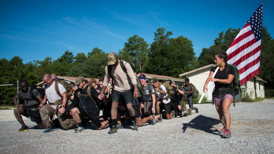 Members perform team lunges as part of the GORUCK Cohesion Challenge Sept. 11, at Eglin Air Force Base, Fla. This elite team-building event, led by a Special Forces veteran, featured military inspired challenges and missions. Only 24 out of the original 27 completed all obstacles. Eglin is the fifth base to complete the Team Cohesion Challenge. (U.S. Air Force photo/Tech. Sgt. Jasmin Taylor)