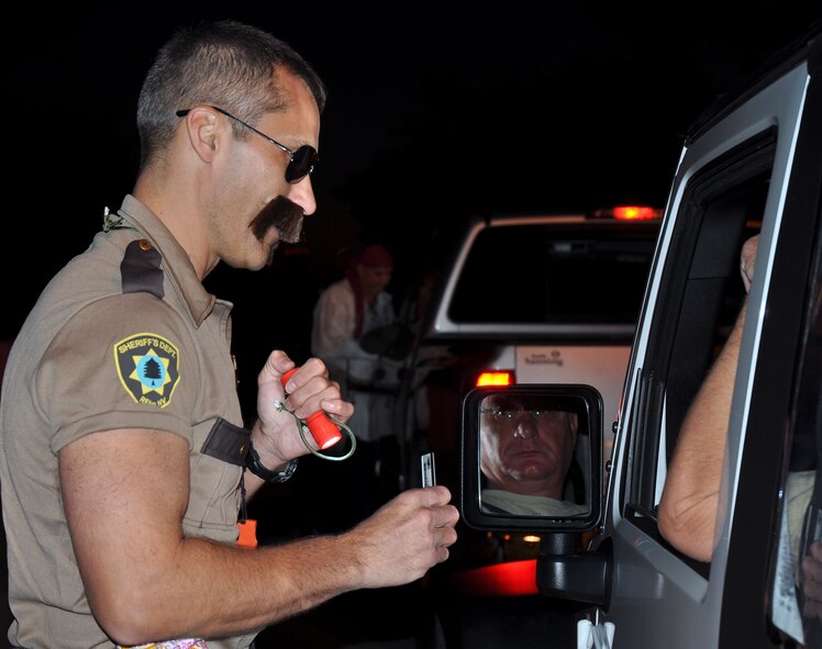 A member of the “Reno 911” Sheriff’s Department aka Col. Robert Bruckner, 919th Special Operations Wing vice commander, and Chief Master Sgt. Tom Mason, the 919th SOW command chief, dressed as a pirate check IDs and gives out candy for Halloween the morning of the November UTA. (U.S. Air Force photo/Dan Neely)