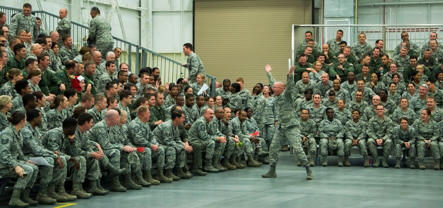 Chief Master Sgt. Tom Mason, 919th Special Operations Wing, starts the wave during the annual 919th Special Operations Wing commander’s call Dec. 7, at Duke Field Fla. Col. Jim Phillips, 919th SOW commander, briefed on safety, sexual assault prevention and took questions from the audience. (U.S. Air Force photo by Tech. Sgt. Jasmin Taylor)