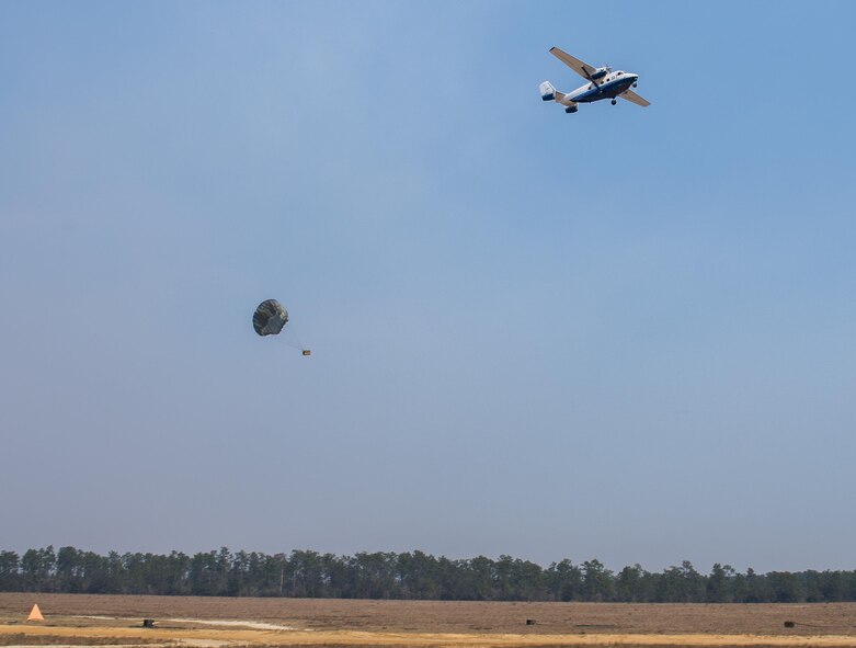 A parachuted bundle soars out of the back of a C-145 Skytruck during an airdrop mission over the Eglin Air Force Base range. New and prior-qualified loadmasters release sandbags and 300-pound boxes from the 919th Special Operations Wing aircraft to as part of their initial airdrop or proficiency training. The 919th Special Operations Logistics Readiness Squadron’s Airmen are responsible for packing, securing and recovering the equipment and parachutes. (U.S. Air Force photo/Sam King)