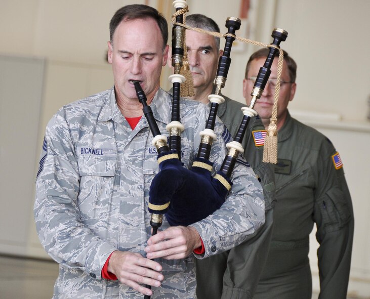 The official party enters to the playing of bagpipes during the retirement ceremony of Lt. Col. Tom Miller, 919th Special Operations Wing, Feb. 4 at Duke Field, Fla. (U.S. Air Force photo/Dan Neely)