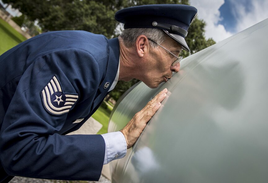 Tech. Sgt. Robert Wegeman, 919th Special Operations Wing, kisses his F-106A Delta Dart, now a static display at Tyndall Air Force Base, Fla. Wegeman, who was crew chief for the aircraft, used to kiss the F-106 goodbye before every sortie. He wanted to give his aircraft one final kiss before he retired after 41 years of service. (U.S. Air Force photo/Tech. Sgt. Sam King)
