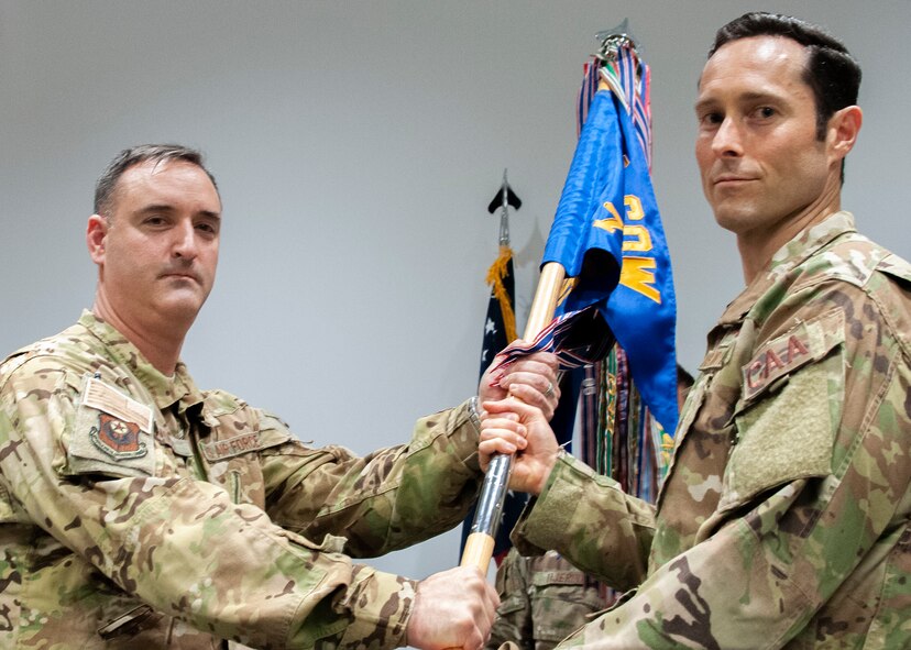 Lt. Col. William "Wylie" DeWalt (right) accepts command of the 711th Special Operations Command from Col. Roland Armour, 919th Special Operations Group, in a ceremony at Duke Field, Fla., April 5, 2019. DeWalt joined the 711th SOS in 2013 and now returns as the commander of the Air Force Reserve's only unit trained in the Combat Aviation Advisor mission set. (U.S. Air Force photo by Lt. Col. James R. Wilson)