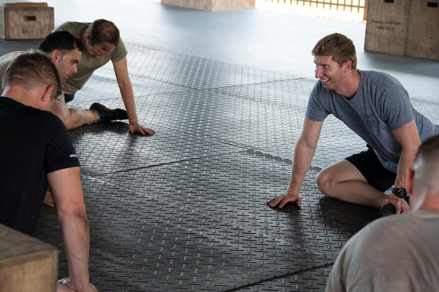 Mr. Jared Kist, strength and conditioning specialist for the Preservation of the Force and Family Program at Duke Field, leads exercises intended to cool down for Citizen Air Commandos at the Performance Maintenance Pad July, 31, 2019. The pad is an Air Force Special Operations Command initiative that allows trained human performance specialists to conduct proactive conditioning for Duke Field Airmen. (U.S. Air Force photo by Lt. Col. James R. Wilson)