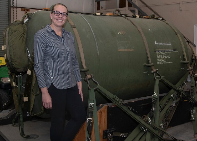 Ms. Samantha Ervin, museum administration specialist, stands next to the BLU-82/B armament Oct. 11, 2019, Air Force Armament Museum, Eglin Air Force Base, Fla. The bomb was recent delivered to the museum by members of the 919th Special Operations Wing at nearby Duke Field so it could be added to the museum's inventory and prepared for display to educate others on the history of the Air Force's mission on the Emerald Coast. (U.S. Air Force photo by A1c Dylan Gentile)