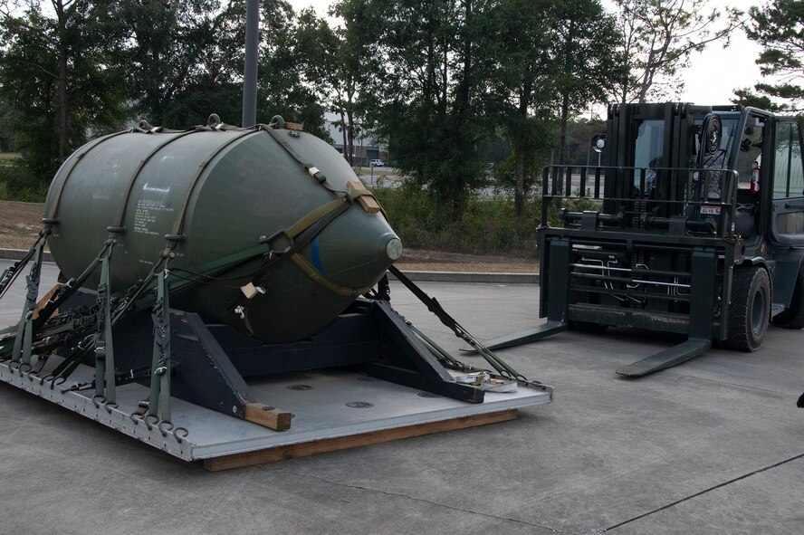 A member of the 919th Special Operations Logistics Readiness Squadron uses a forklift to prepare a BLU-82/B armament for transport Oct. 9, 2019, from Duke Field, Fla. to the nearby Air Force Armament Museum.The BLU-82/B was used for the psychological effects it had on the enemy in the Operation Desert Storm and more recently during the war in Afghanistan. Aircrew from Duke Field, dropped the ordnance in training and combat operations and can now see it on display at the museum as a piece of history. (U.S. Air Force photo by Lt> Col. James R. Wilson)