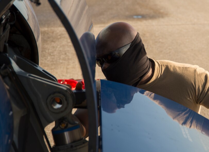 Tech. Sgt. Dante Davis, a crew chief with the 919th Special Operations Aircraft Maintenance Squadron, wears additional personal protective equipment while inspecting a C-146A Wolfhound aircraft at Duke Field, Fla., April 13, 2020. Davis recently completed upgrade training in spite of restrictions put in place to reduce the spread of the corona virus. (U.S. Air Force photo by Nicole King)