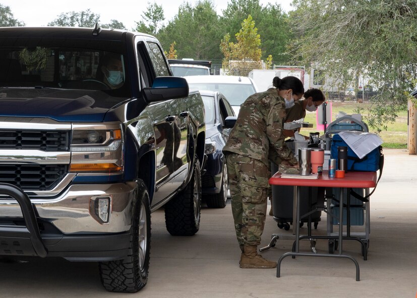 Members of the 919th Special Operations Medical Squadron administer flu vaccinations to reservists in their vehicles at Duke Field, Florida, Nov. 7, 2020. The 919th SOMDS held their first ever drive-thru vaccination line to keep reservists medically ready while maintaining social distancing guidelines for COVID-19. (U.S. Air Force photo by Tech. Sgt. Jonathan McCallum)