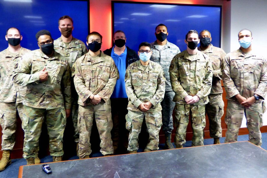 Air Force Special Operations Command Airmen pose for a photo after completing the command's Mission Defense Conference at Hurlburt Field, Fla., Feb. 5, 2021. The conference focused on identifying the organic cyber capabilities needed to protect missions against threats in, through, and from cyberspace. (U.S. Air Force photo by Senior Airman Brandon Esau)