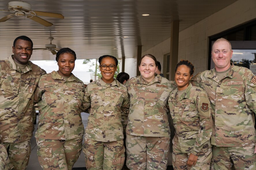 Master Sgt. Melissa Hill, outgoing Development and Training Flight instructor, poses with some of her former students at Duke Field, Florida, November 6, 2022. The D&TF is preparatory training for newly enlisted members that have not yet attended basic training. (U.S. Air Force photo by Senior Airman Dylan Gentile)