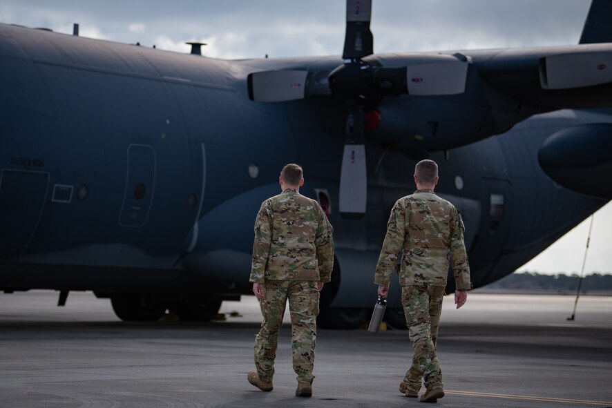 From left, Senior Master Sgt. John Gabel, 5th Special Operations Squadron flight engineer, and Master Sgt. Frank Veres, 492nd Special Operations Training Support Squadron flight engineer, walk towards an MC-130H Combat Talon II at Hurlburt Field, Florida, January 11, 2023. The flight engineers coordinated the safe-landing of the aircraft without functional navigation, communication systems, or lighting, by using flashlights. (U.S. Air Force photo by Senior Airman Dylan Gentile)