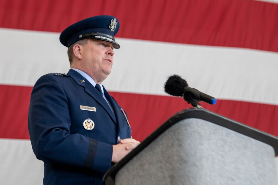 U.S. Air Force Lt. Gen. Tony Bauernfeind addresses an audience during the Air Force Special Operations Command change of command ceremony at Hurlburt Field, Florida, Dec. 9, 2022. During the ceremony U.S. Air Force Lt. Gen. Tony Bauernfeind assumed command of AFSOC from U.S. Air Force Lt. Gen. Jim Slife. (U.S. Air Force Photo by Airman 1st Class Alysa Knott)