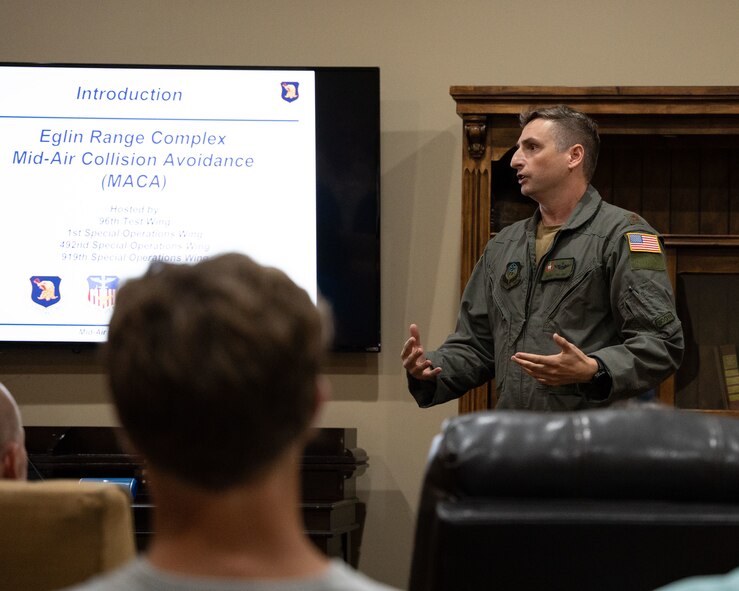 Major Brent Dillard, 492nd Special Operations Wing safety officer, speaks to attendees of an annual Mid-Air Collision Avoidance conference in Destin, Florida, August 10, 2023. The MACA conference brings together aircraft safety representees from area bases with civilian in general aviation to refine safety in dedication to safe flying for all. (U.S. Air Force photo by Tech. Sgt. Jonathan McCallum)
