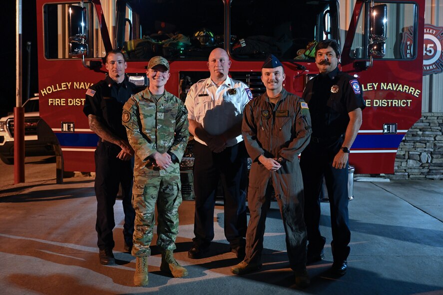 U.S. Air Force Airmen, civilians and Holley-Navarre Fire District firefighters pose for a group photo at the Holley-Navarre Fire District Station 45, in Navarre Florida, Nov. 25, 2024. Two Airmen assigned to Hurlburt Field and several civilians came together to rescue a mother and her young son from a submerged vehicle in a retention pond in Navarre, Florida, on Nov. 3, and their efforts were recognized during a ceremony for saving the lives of the victims. (U.S. Air Force photo by Airman 1st Class Joey Weis-Petticord)
