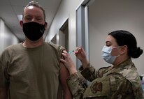 U.S. Air Force Staff Sgt. Erich Miller, operational medicine technician for the 919th Special Operations Medical Squadron, vaccinates Lt. Gen. Jim Slife, commander of Air Force Special Operations Command, with a COVID-19 vaccine at Duke Field, Fla., Feb. 6, 2021. Slife toured the 919th Special Operations Wing COVID-19 vaccination point of distribution with 919th SOMDS leadership during his visit to Duke Field. (U.S. Air Force photo by Senior Airman Dylan Gentile)