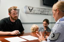Tech. Sgt. Amy Busenbark, 351st Recruiting Squadron recruiter, explains an enlistment form to Craig Anderson, U.S. Air Force enlistee at Fort Walton Beach, Florida, July 8, 2021. Recruiters devised new methods such as conducting enlistments virtually to keep recruiting numbers steady despite challenges brought on by the COVID-19 pandemic. (U.S. Air Force photo by Senior Airman Dylan Gentile)