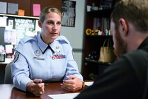 Maj. Zachary Wilson, an 859th Special Operations Squadron flight surgeon, speaks with a coworker at Duke Field, Florida, July 28, 2020. Flight surgeons provide medical guidance to unit commanders, and help ensure Centers for Disease Control and Prevention guidelines are being followed in their squadrons. (U.S. Air Force photo by Senior Airman Dylan Gentile)