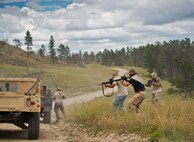 919th Special Operations Security Forces Squadron Airmen perform an ambush scenario against two vehicles during the squadron’s annual training at Camp Guernsey, Wyo., Aug. 4. More than 20 Airmen went out West to help train two other Reserve security forces squadrons in ground combat and field training. The 919th SOSFS Airmen lived in the makeshift camps and acted as opposing forces and local villagers interacting with the occupying security teams. (U.S. Air Force photo/Tech. Sgt. Sam King)